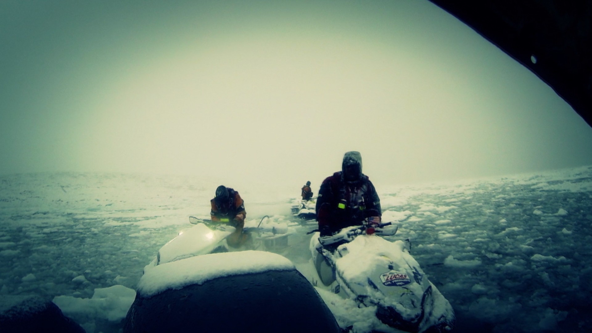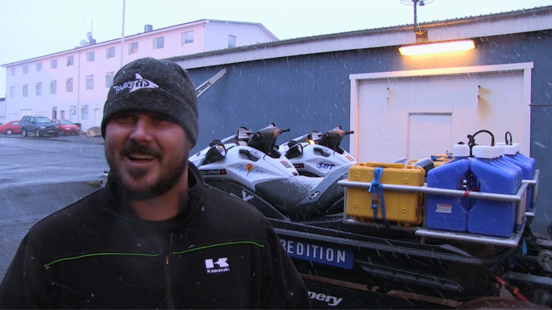 The men arrive in Iceland to find their jet ski is still in transit. Snow and Ice hamper the crew’s departure. The team finds a village buried by a volcano.