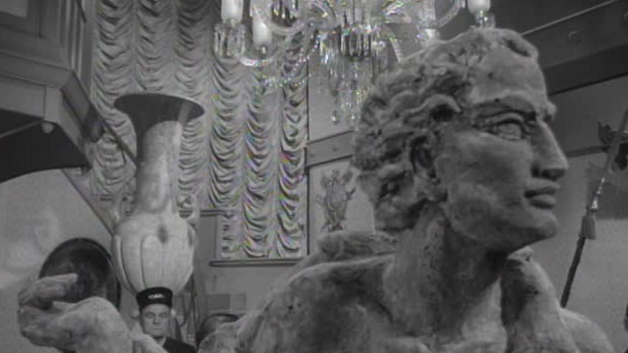 Gov. Bradford and his secretary, Miss Piecemeal, watch as the governor's statue is unveiled during a private showing at the Bolt Museum. Suddenly, the statue blinks, and Bradford, immobilized by an injection, is taken prisoner.