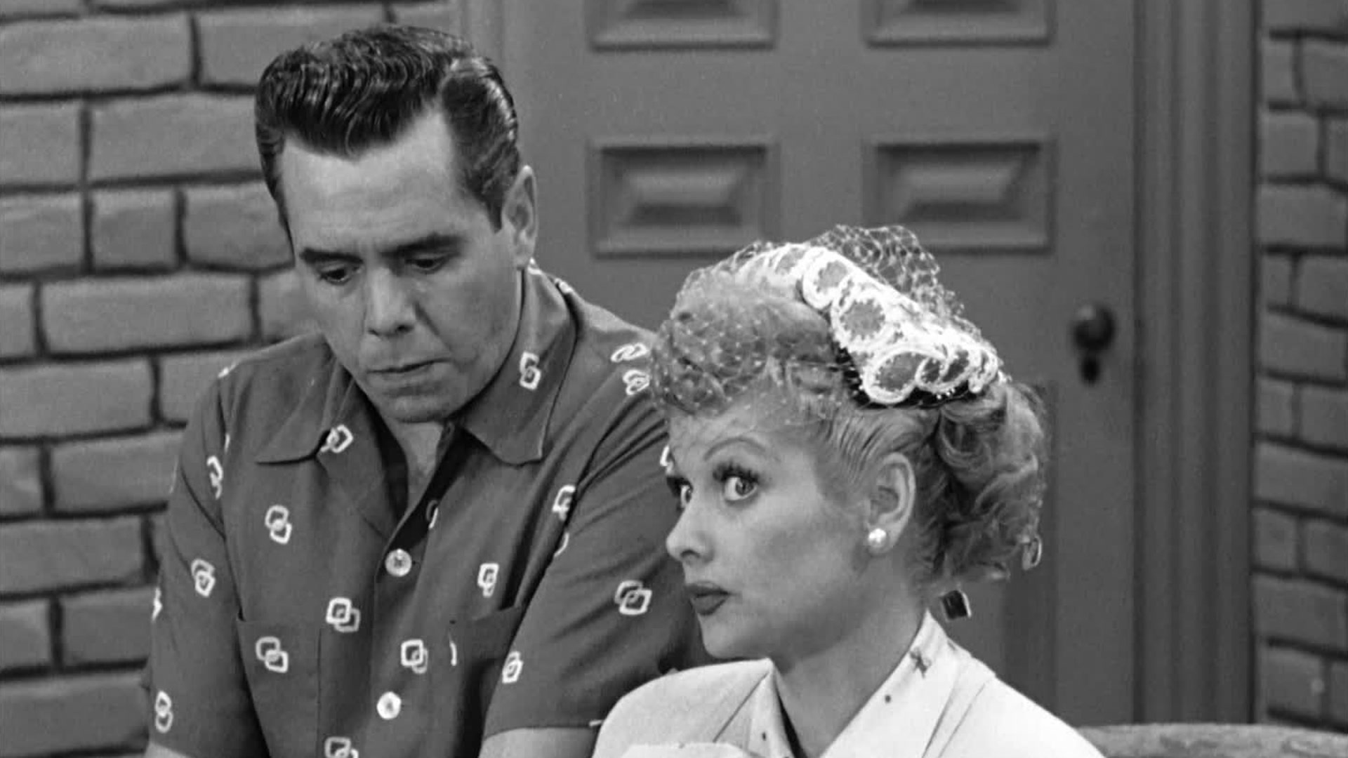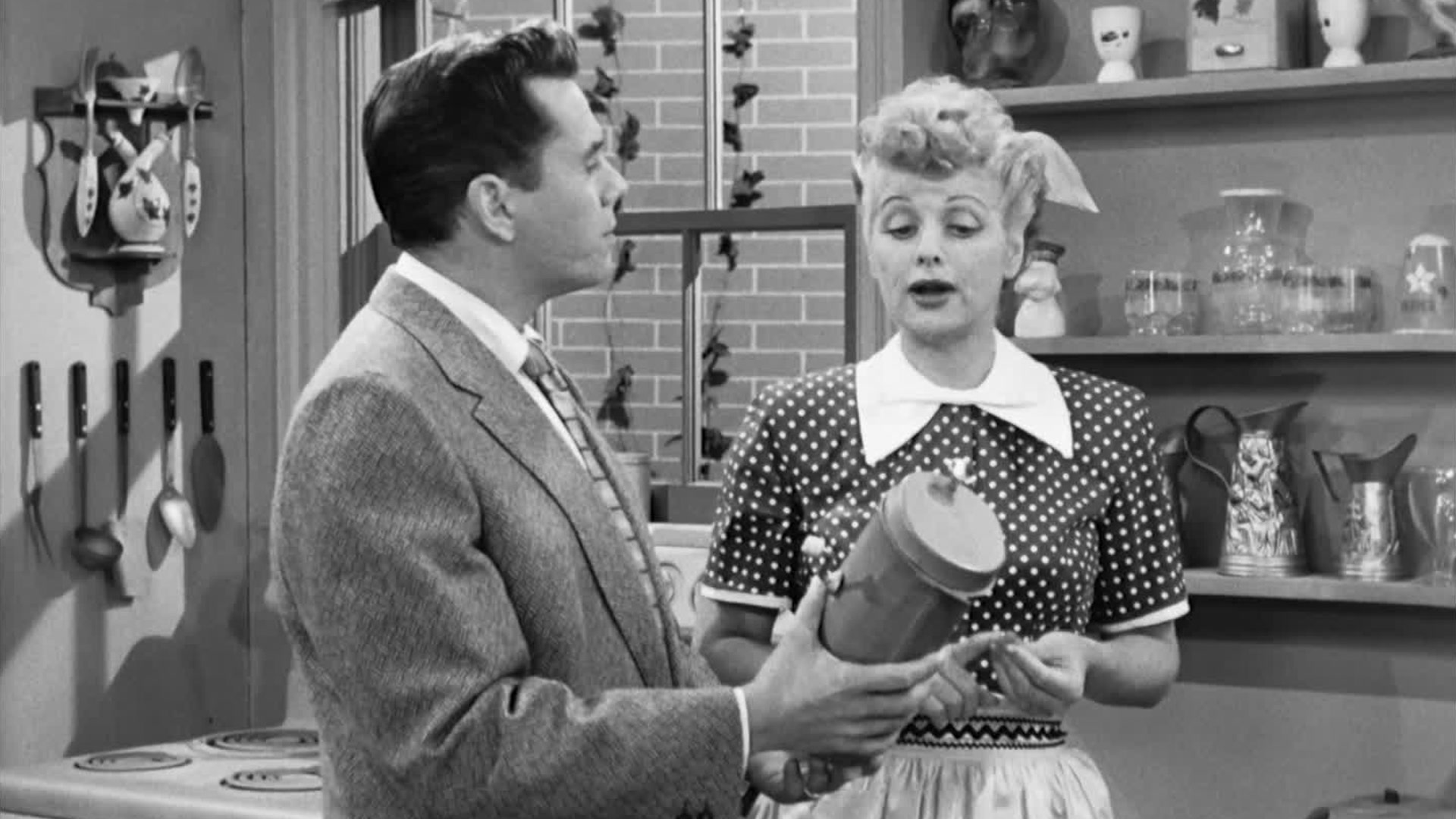 After seeing Fred use a pair of trick handcuffs, Lucy uses a similar pair to attach herself to Ricky as gag. She wants him to stay at home and not go to a rehearsal for a live TV show the next day.