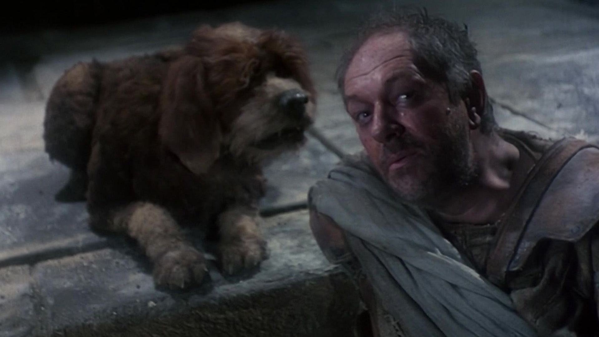 A storyteller in a labyrinth tells his dog the stories of Perseus and Medusa, Icarus and Daedalus, Theseus and the Minotaur, and Orpheus and Euridyce.