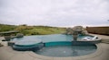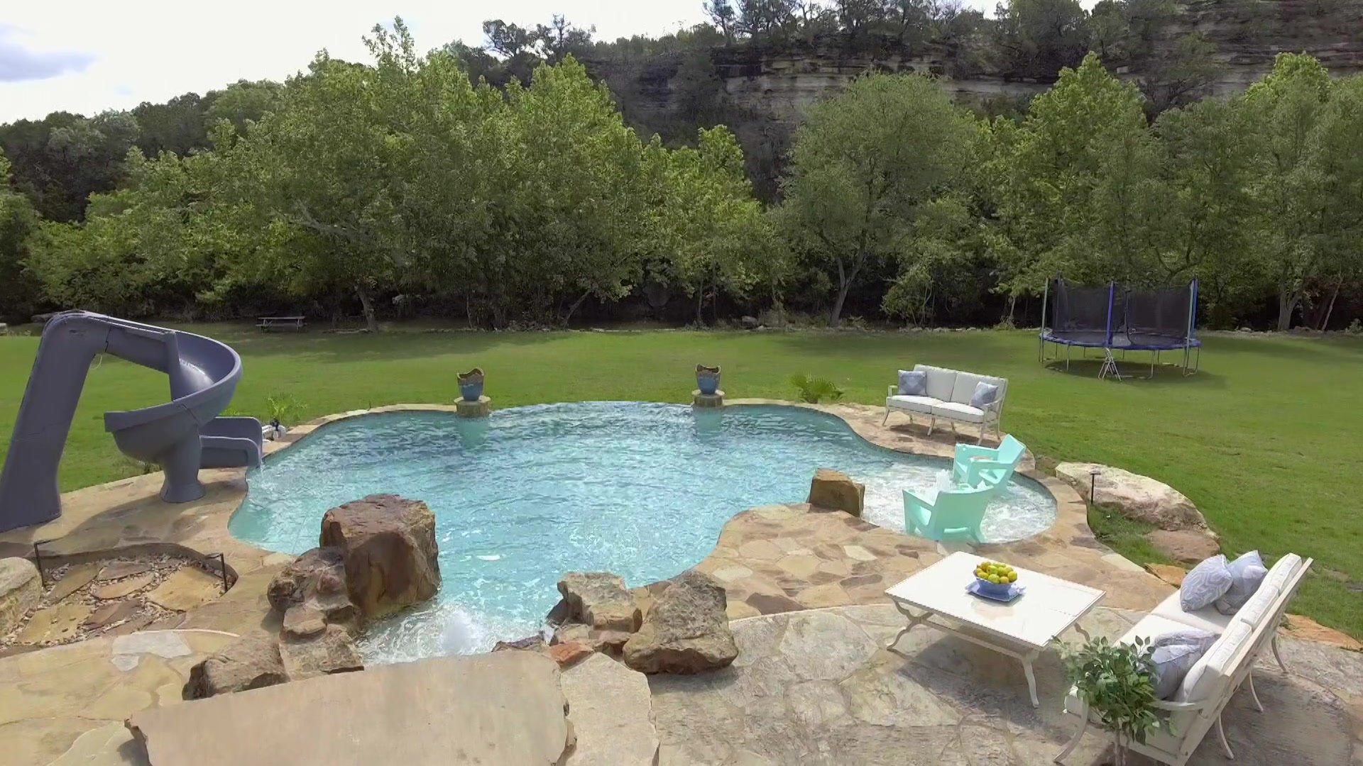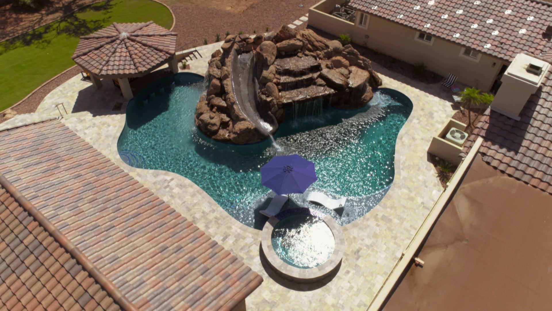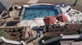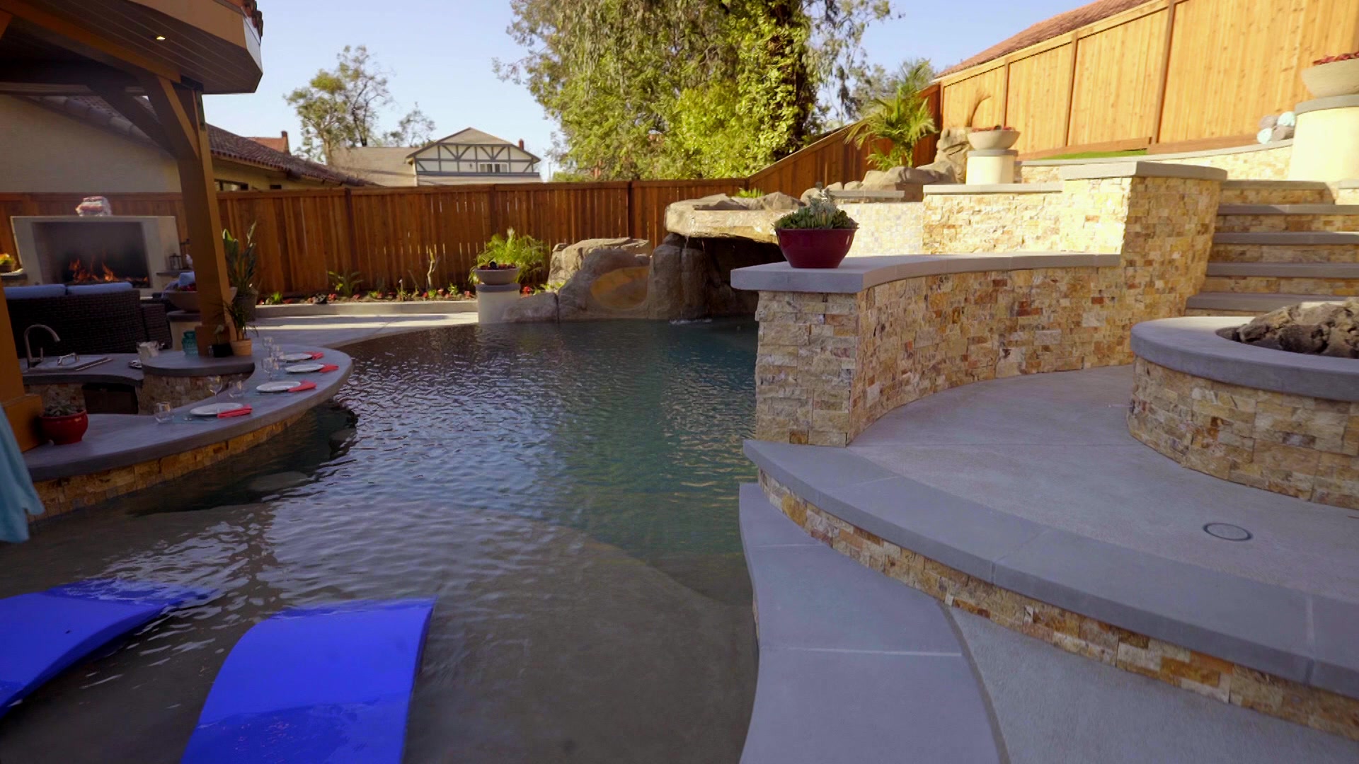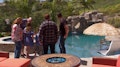 The guys create a resort-like pool that includes a waterfall and a slide.