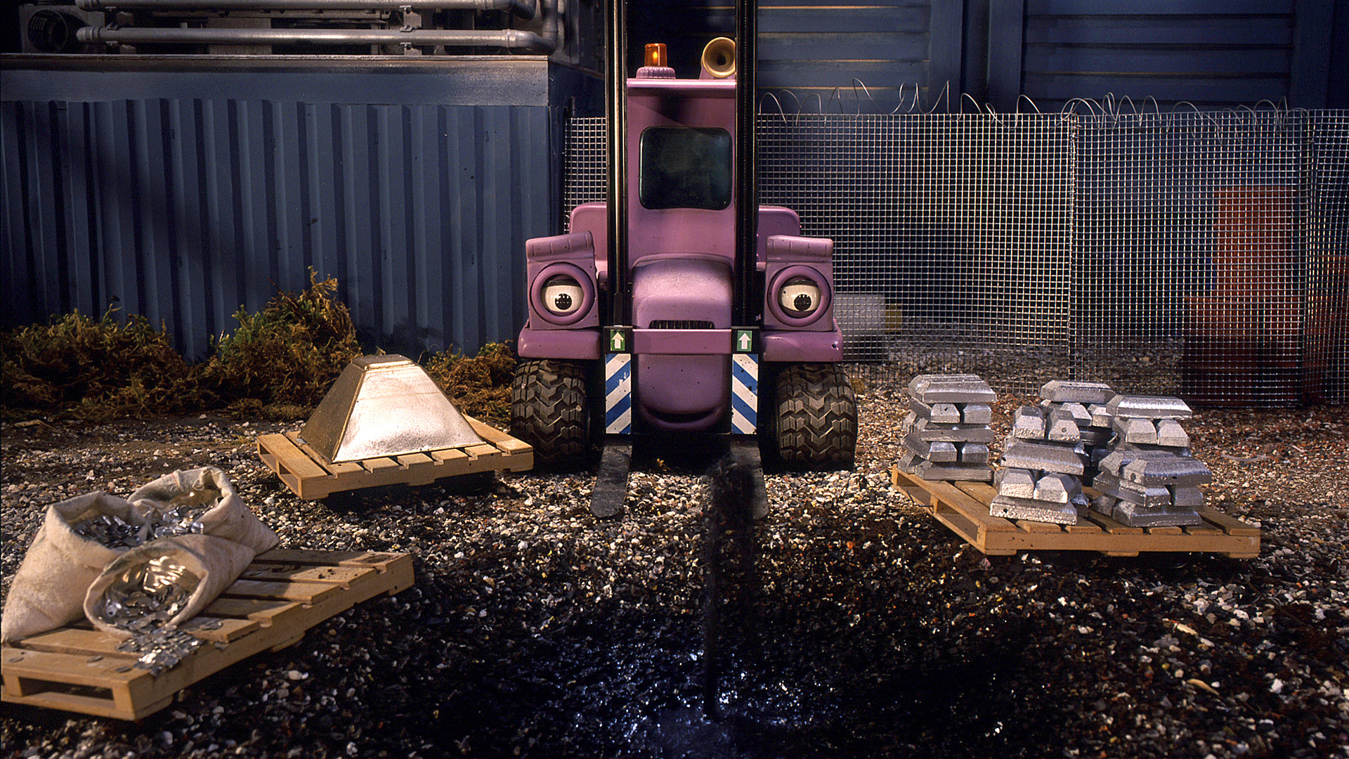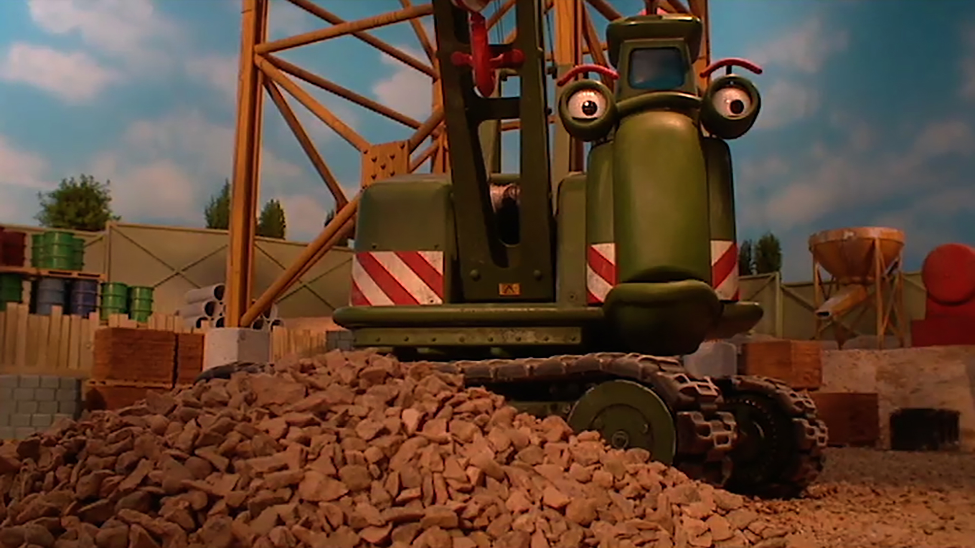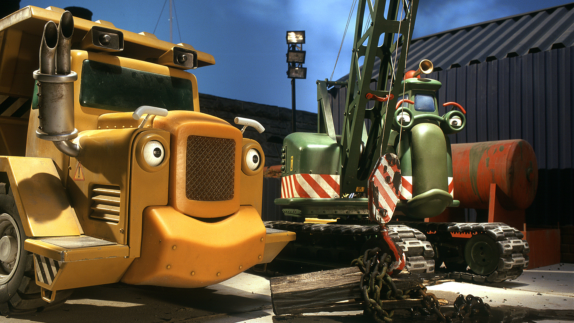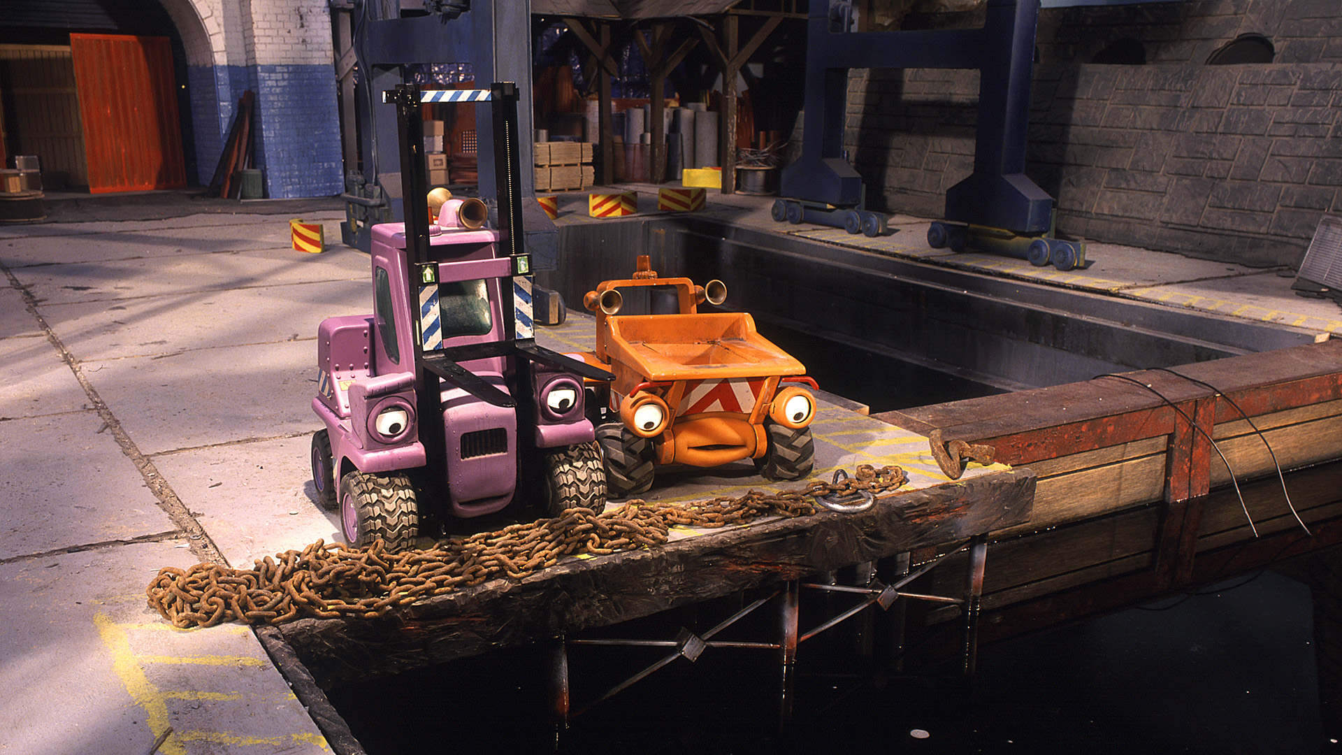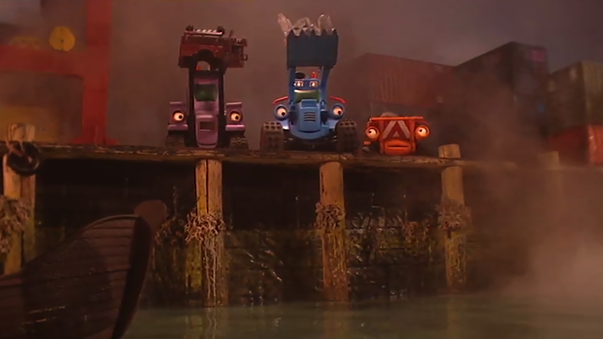 When the younger machines accidentally knock a load of oil drums into the dock they are too scared to own up to their mistake.