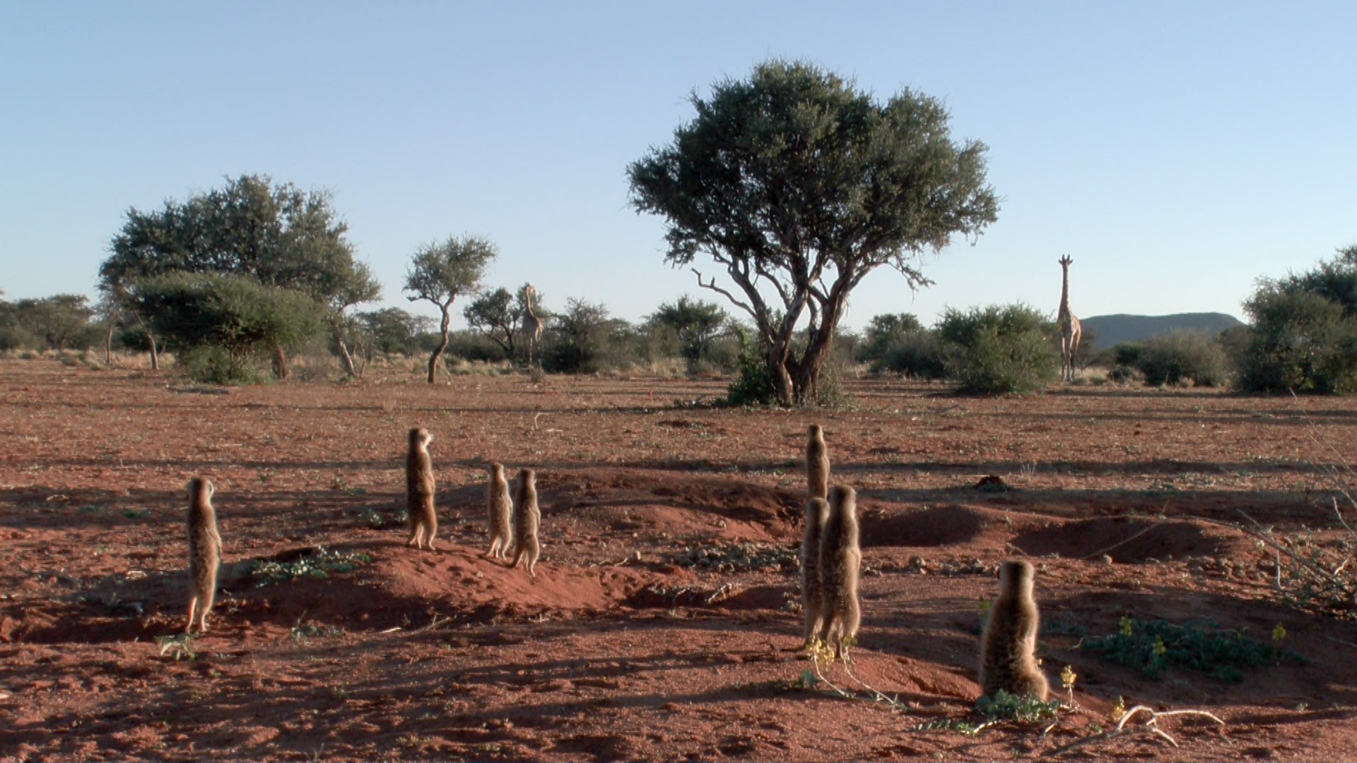 Summer has arrived in the Kalahari. It has been three weeks since the last rains and the desert is flourishing. A large group of giraffe have moved into the area which has been unsettling for the gang.