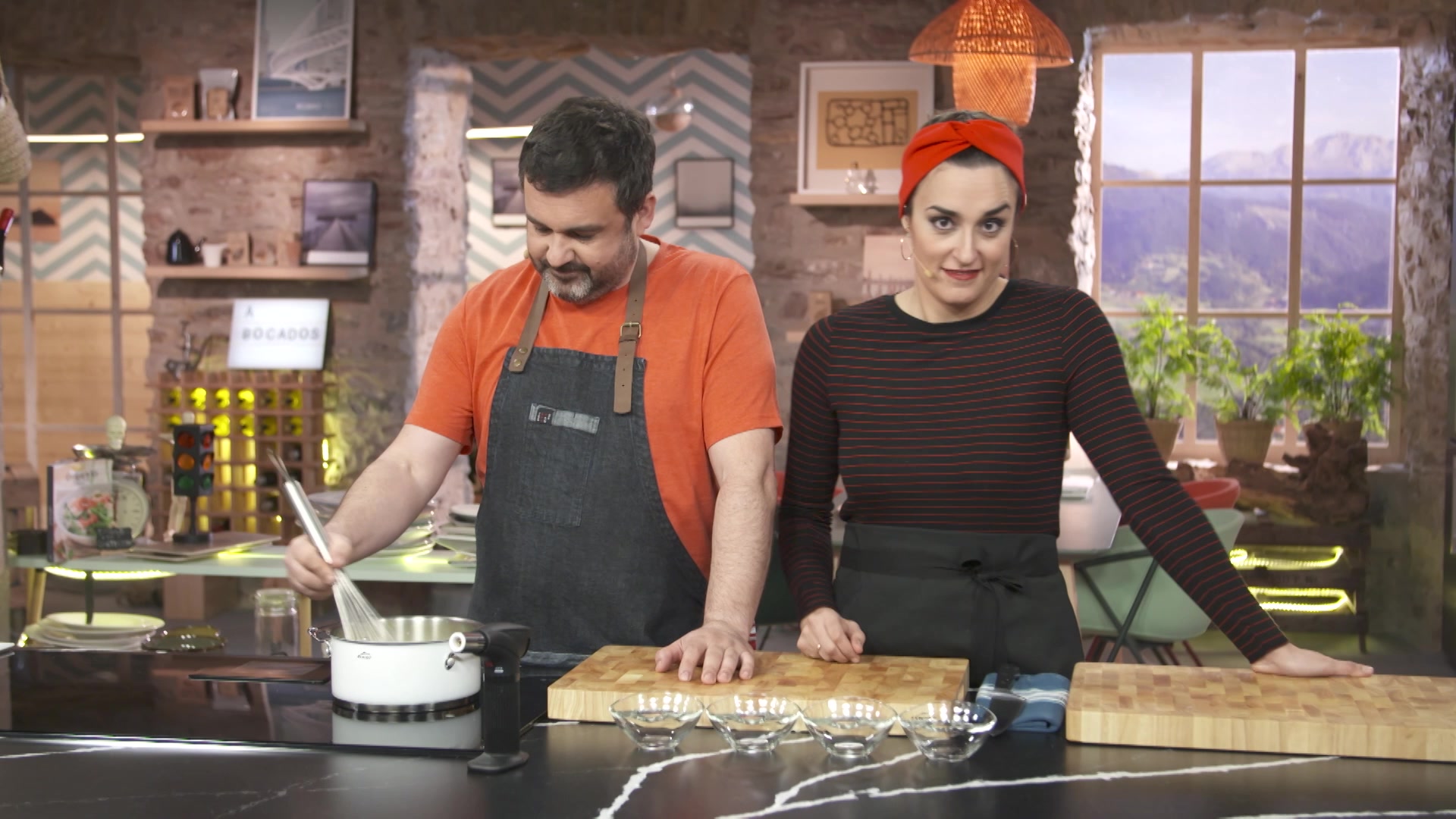 El cocinero Ander Gonzalez elabora una receta mientras la nutricionista Gabriela Uriarte explica las propiedades de los ingredientes utilizados y analiza el equilibrio dietetico de las recetas.
