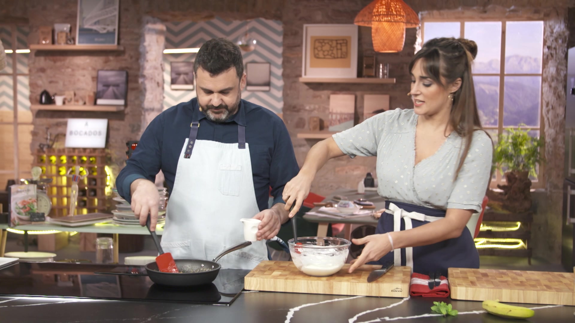 El cocinero Ander Gonzalez elabora una receta mientras la nutricionista Gabriela Uriarte explica las propiedades de los ingredientes utilizados y analiza el equilibrio dietetico de las recetas.