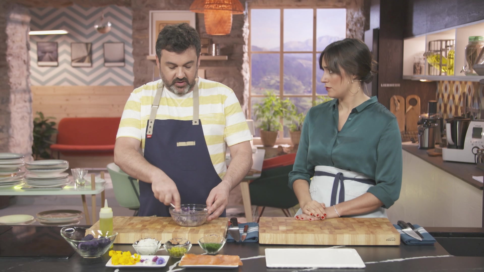El cocinero Ander Gonzalez elabora una receta mientras la nutricionista Gabriela Uriarte explica las propiedades de los ingredientes utilizados y analiza el equilibrio dietetico de las recetas.