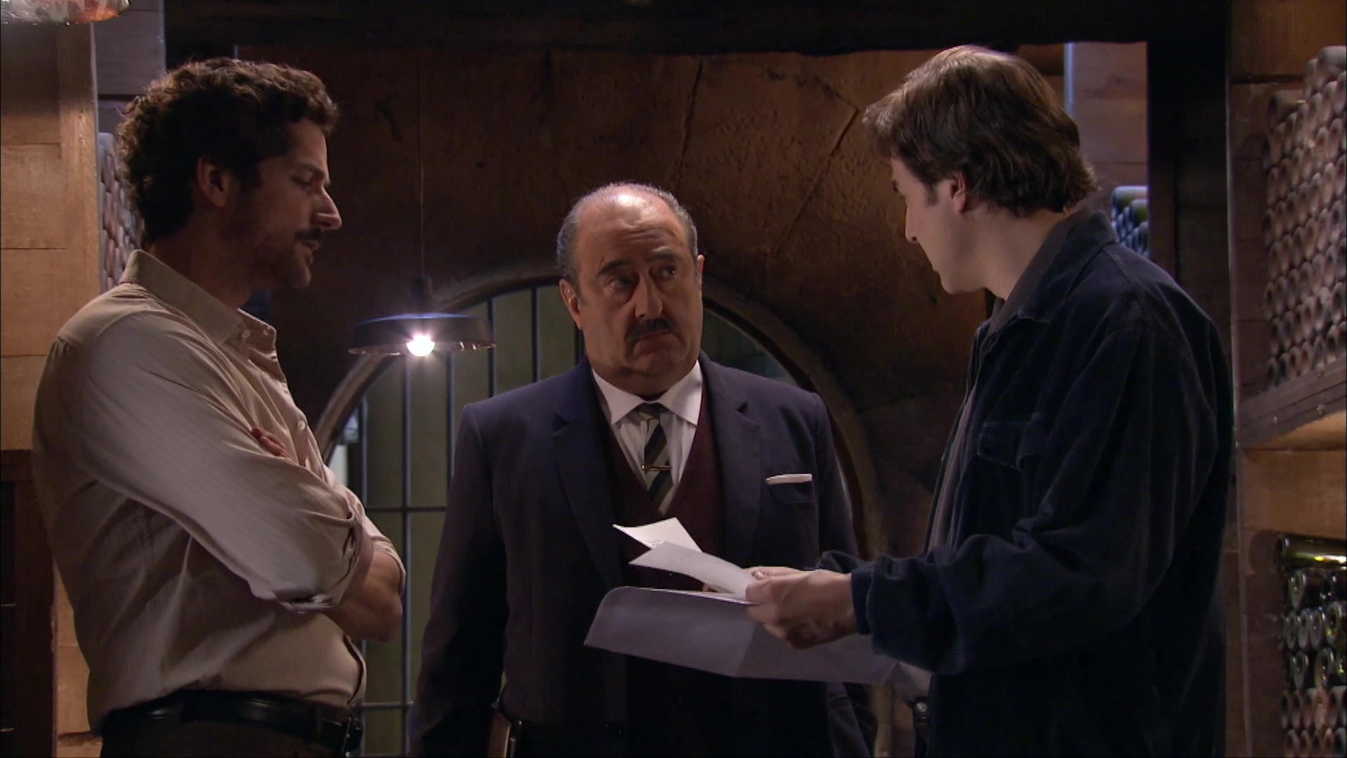 Vicente, Rafael y Andrés acuden discretamente a la bodega en busca del supuesto cadáver pero allí no hay nada.