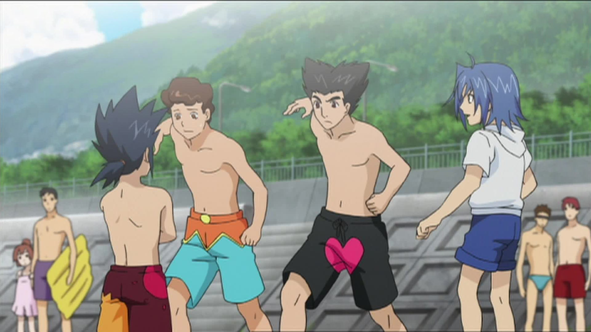 Aichi slept late and is thus the last to get up. Kai and Koutei have woken up before everyone else and are already engaged in cardfighting.