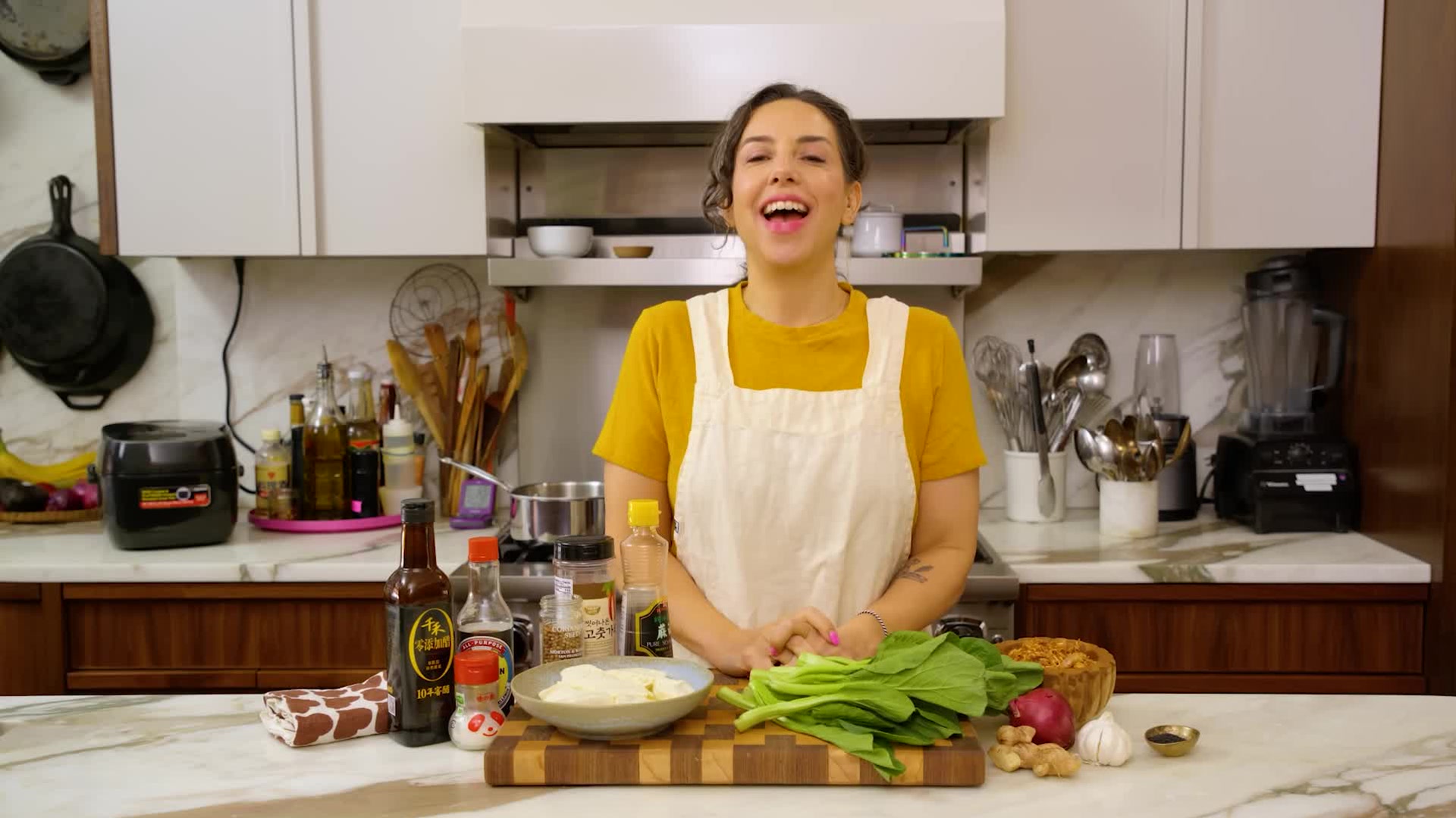 Carla Lalli Music makes tofu, sizzled ginger, and greens with a salmon lentil situation.