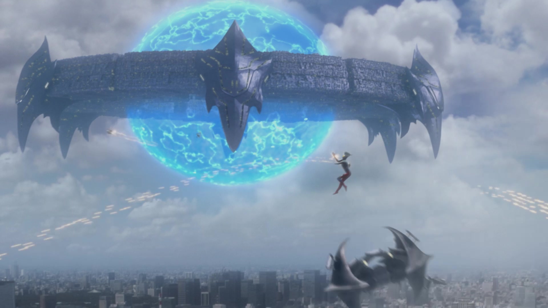 This is the first installment episode of the movie, "Ultraman Saga"! The new member Taiga Nozomu of Super GUTS Mars Base is surrounded by a giant dome during battle.