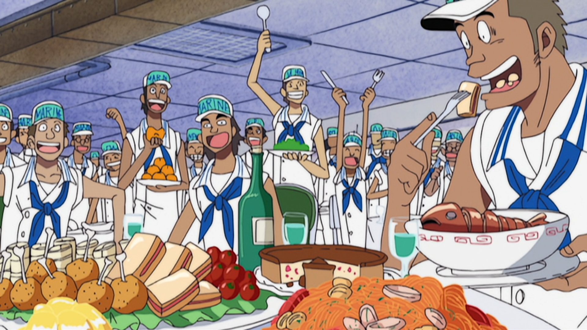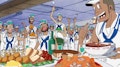 Luffy’s insatiable appetite betrays his true identity, and yet another member of his crew ends up in the brig when two Straw Hats try to fool Commander Jonathan with the same disguise!