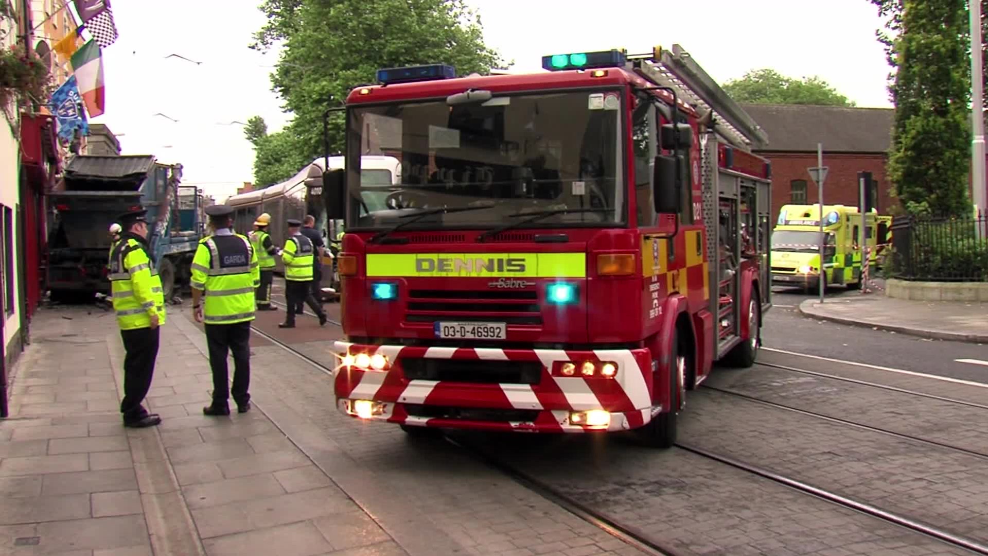 Firefighters rush to the scene of a major crash in the city centre where a head-on collision with a truck has derailed a Luas tram.