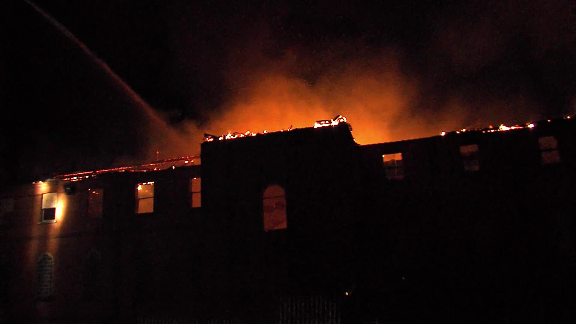 The firefighters are called out to an old military building which has a dangerous fire spreading through the roof.