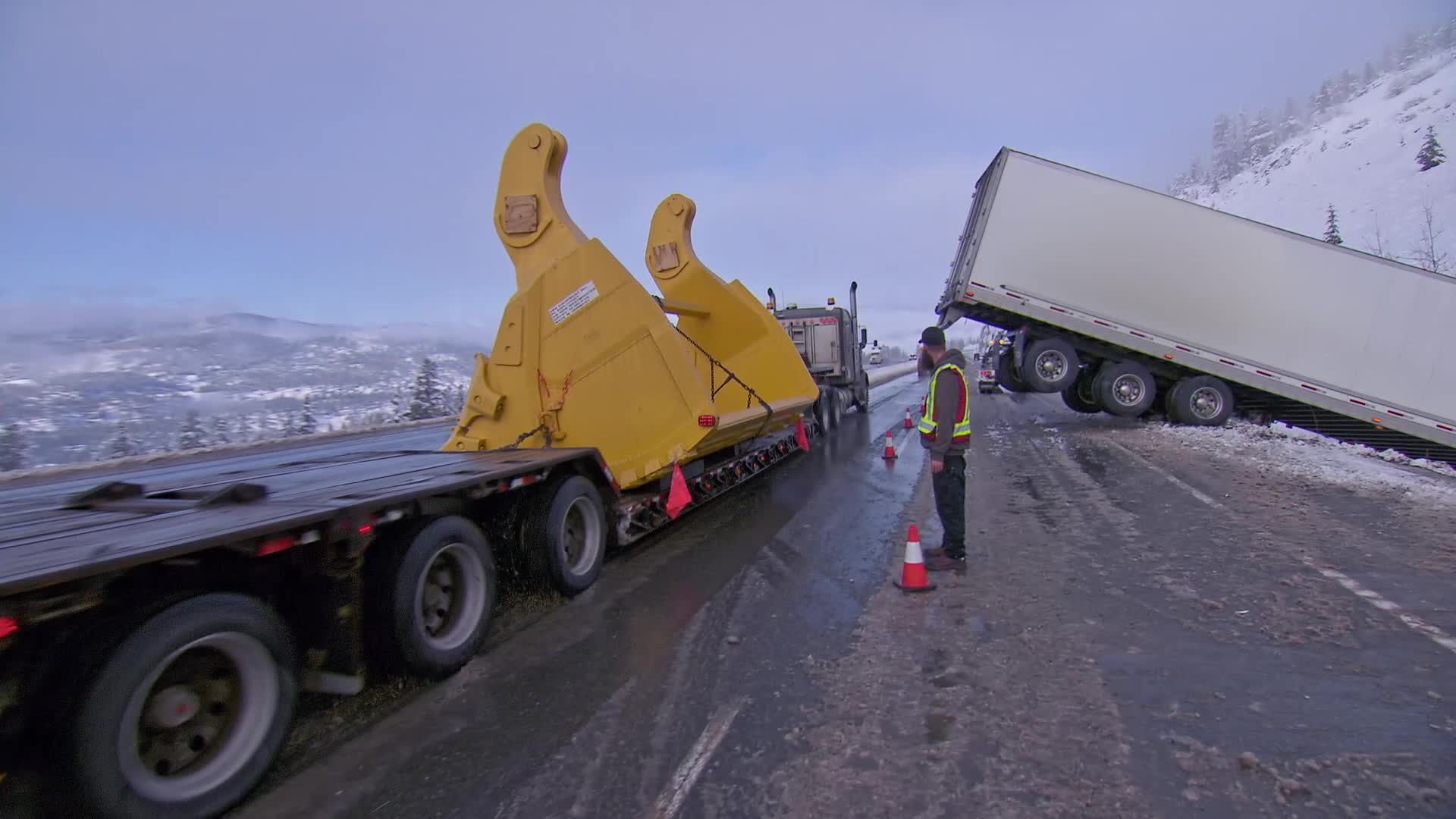 Mitch discovers a massive wreck involving two semis.