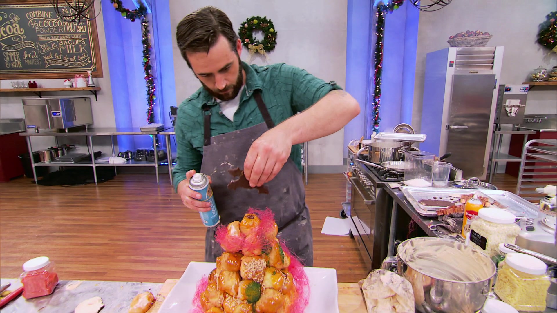 The bakers make dessert stockings and build cream puff Christmas trees.
