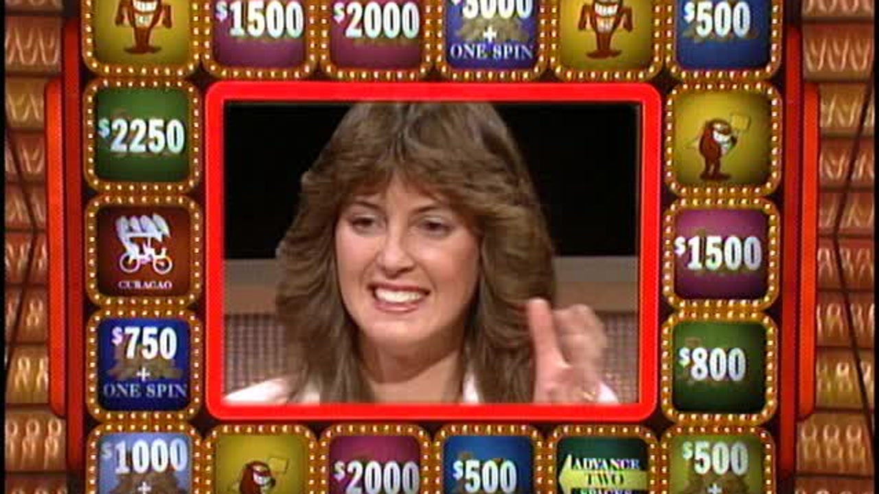 Three players use spins on a wheel to collect cash and prizes while trying to avoid the "Whammy," which bankrupts a player.